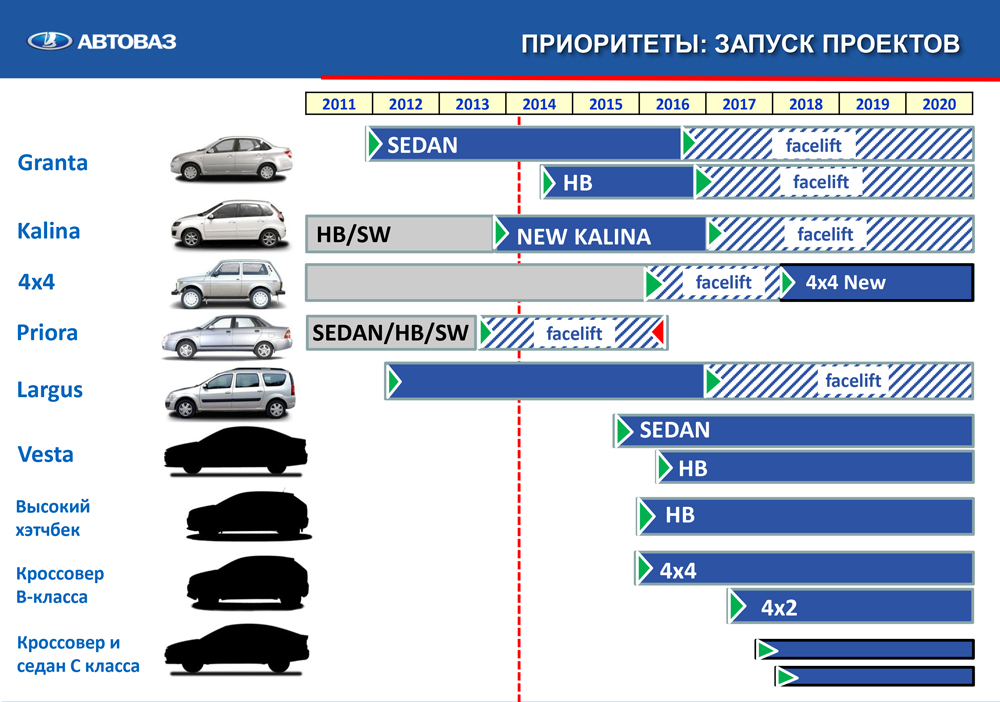 Обновление уже выпускаемых моделей начнётся в 2016-м году с моделей 4x4 и Granta, в 2017-м году снова обновится Kalina и впервые Largus.