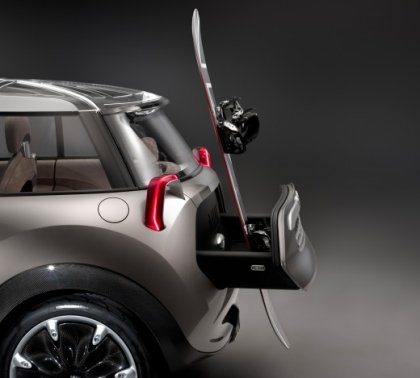 Несмотря на знакомую внешность, концепт MINI Rocketman кардинальным образом отличается от серийных братьев по бренду: кузов новинки построен на базе пространственной рамы из карбона, дверь крепится на двойных шарнирах, облегщающих посадку на тесных парковках, задняя дверь состоит из двух частей, нижняя легко трансформируется в крепление для перевозки лыж и велосипедов, панорамная крыша подсвечивается светодиодами и украшена британским флагом.