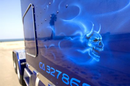 Этот украшенный тремя шестерками на капоте, кастомными деталями экстерьера, аэрографией и оригинальной покраской Peterbilt 379 1990-года выпуска принадлежит отчаянной девушке, независимому перевозчику по имени Sherry Martinez. Девушке этот грузовик достался списанным от крупного перевозчика, в изрядно потрепанном состоянии и намучаться семье Мартинез с ним пришлось изрядно, именно потому в оформлении тягача используется тема потусторонних сил:)