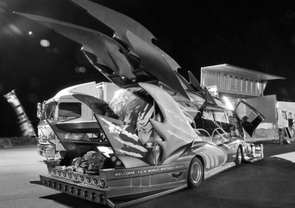 Этот необычный кастом – результат тщательного смешения американской и японских культур: комиксов, вэнов, аниме и декотора. Обычные для подобных фургонов огромные бампера и спойлеры дополняются фирменной раскраской супергероя, ламбодверями и полностью переделанным салоном с сумасшедшей подсветкой. Вряд ли машинка пригодилась бы собственно Бэтмену, т.к. после того как на неё навесили эти тонны пластика, быстрее она точно не стала:)